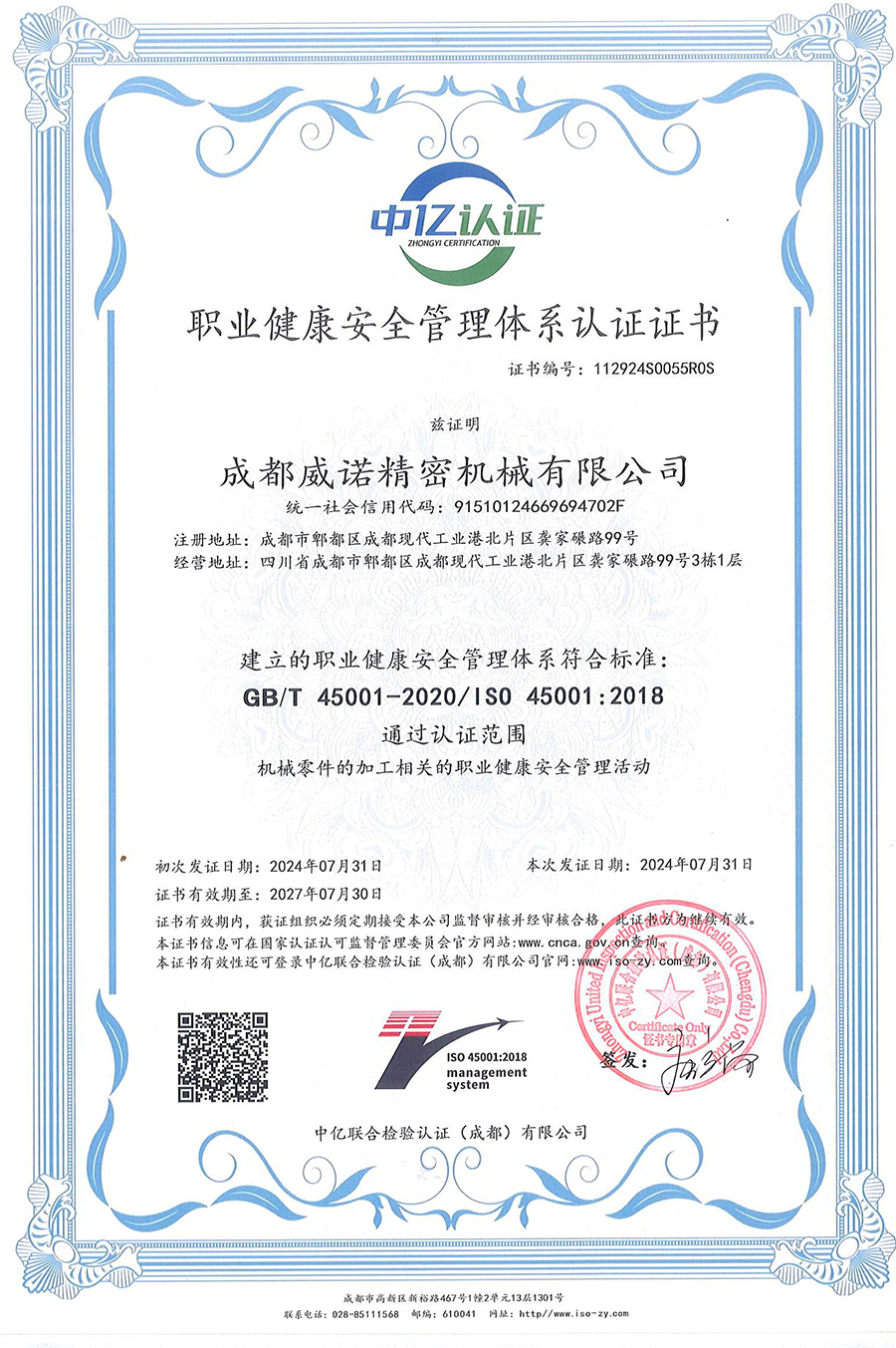 職業(yè)健康安全管理體系認(rèn)證證書(shū)